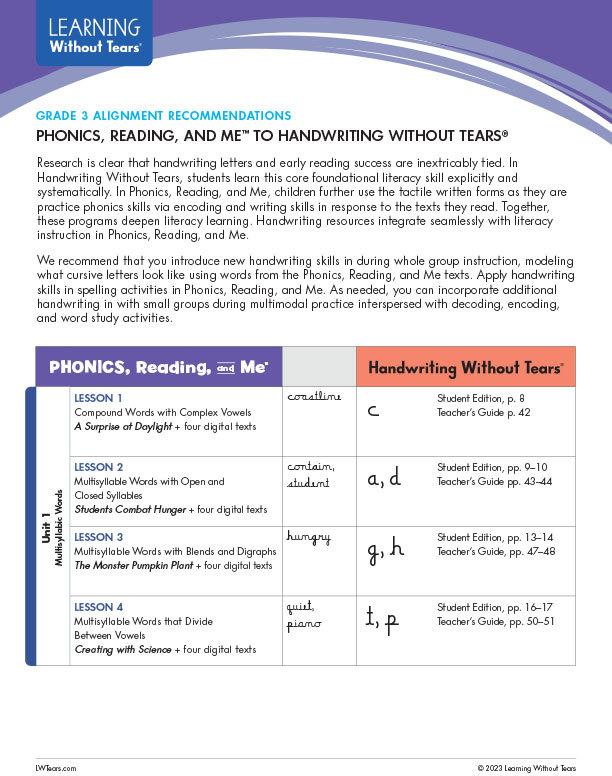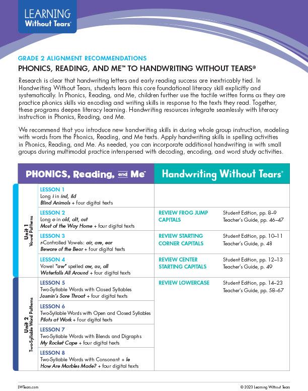 To guide you, we’ve developed grade-level crosswalks that show how to successfully integrate Handwriting Without Tears® with A−Z for Mat Man® and Me or Phonics, Reading, and Me™. In these crosswalks, you’ll see exactly which lessons can be taught together throughout Grades K−3 to maximize your instructional time and reinforce the right skills at the right time.