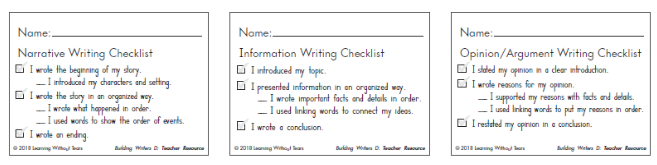 Building Writers includes checklists to assess common characteristics of high writing expectations for each grade level and serve as a tool for teachers and students. For best results, use the checklist alongside others to monitor your students’ writing growth continuously.