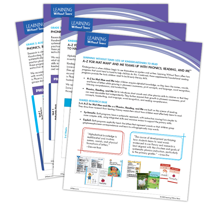 To guide you, we’ve developed grade-level crosswalks that show how to successfully integrate Handwriting Without Tears® with A−Z for Mat Man® and Me or Phonics, Reading, and Me™. In these crosswalks, you’ll see exactly which lessons can be taught together throughout Grades K−3 to maximize your instructional time and reinforce the right skills at the right time.