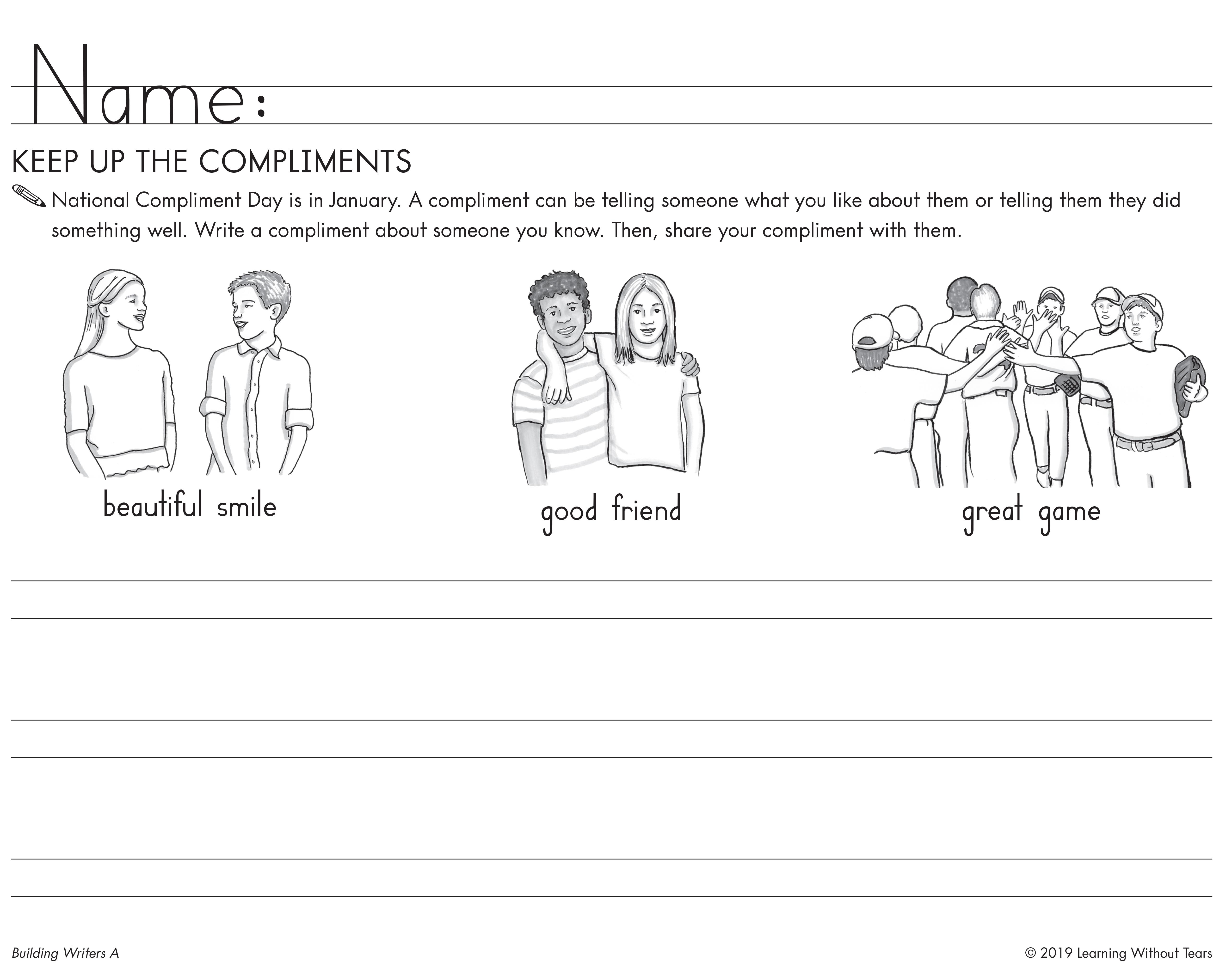National Compliment Day is in January. Your students can learn the value of kind words and practice their core writing skills with our newest Building Writers student edition free downloads!