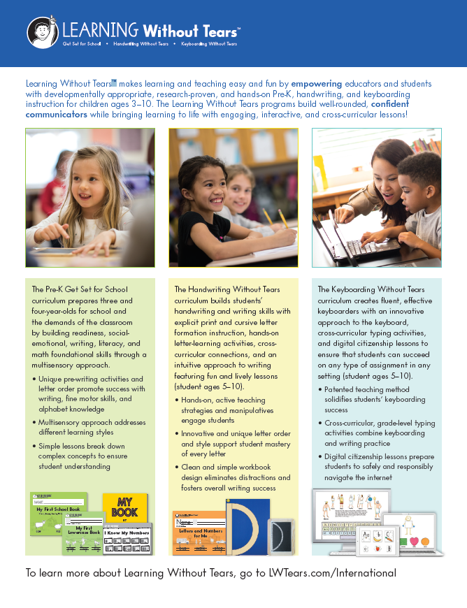 Featuring simple plans to help start the year right for every teacher and student, Learning Without Tears promotes written communication success in the classroom for Pre-K, handwriting, and keyboarding.