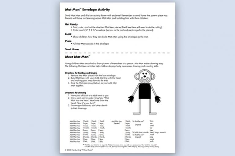 Send Mat Man and this fun activity home with students! Remember to send home the parent piece too. Parents will have fun learning about Mat Man and building him with their children.