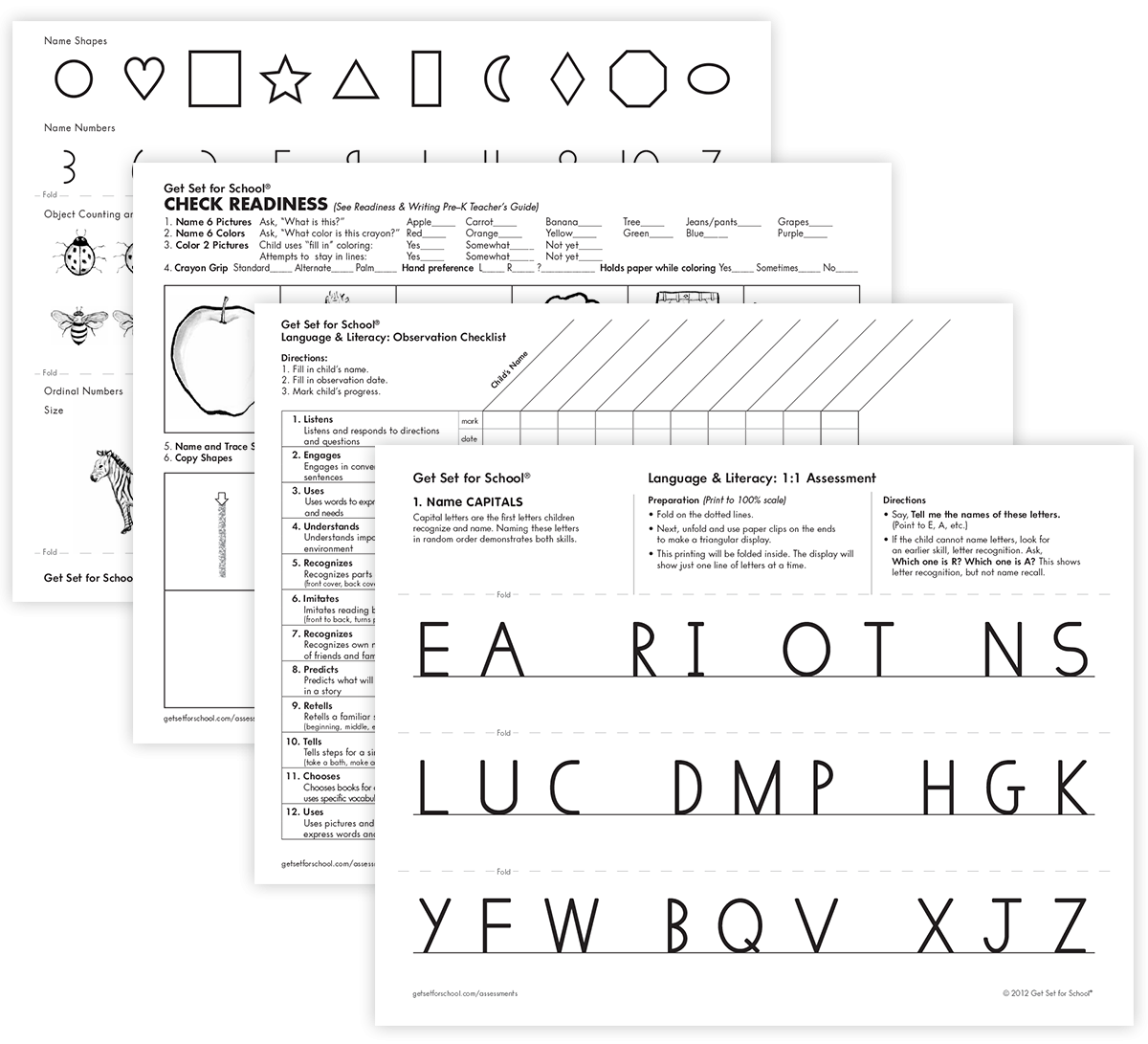 The Readiness & Writing 1:1 Assessment can be used to assess Pre-K children as they develop their skills. You will assess naming colors, shapes, crayon grip, letter naming and writing. Keep track of a child’s response on the Assessment. As you watch children play and participate in activities use our Observation Checklist to note additional skills.