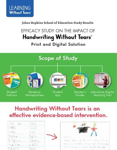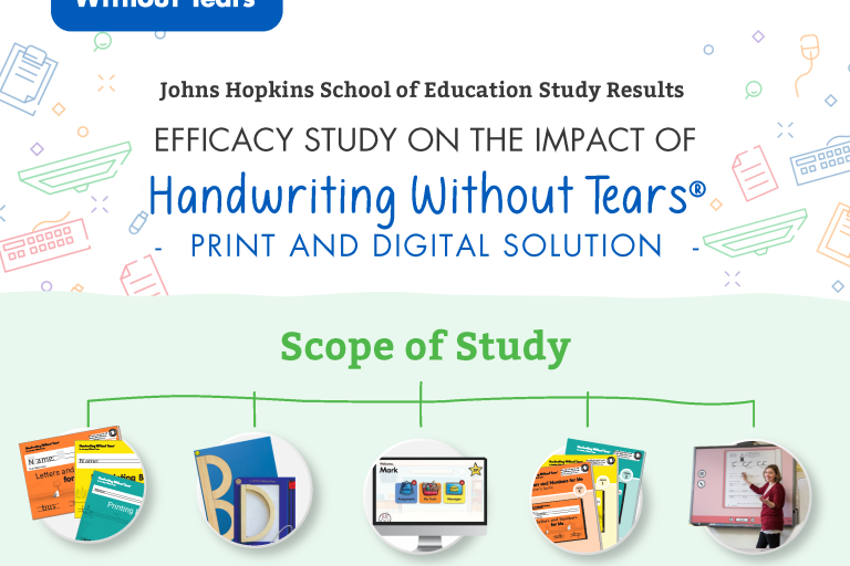 Handwriting plays a foundational role in reading and writing readiness, as validated by a recent Johns Hopkins School of Education efficacy study. The study looked at Handwriting Without Tears® as an evidenced-based intervention and found that the students who participated in the program averaged a more than 3-point gain between fall and spring compared to peers who did not participate in the program.