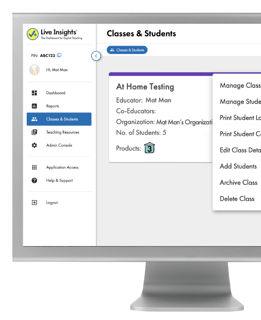 This breakthrough dashboard for digital teaching is your portal for administrative features across the full suite of Learning Without Tears' digital products. Users can generate reports that reviews a district's engagements with our learning products, including a district, school, or classroom's overall curriculum program, the number of active students, and the amount of time spent on each program.